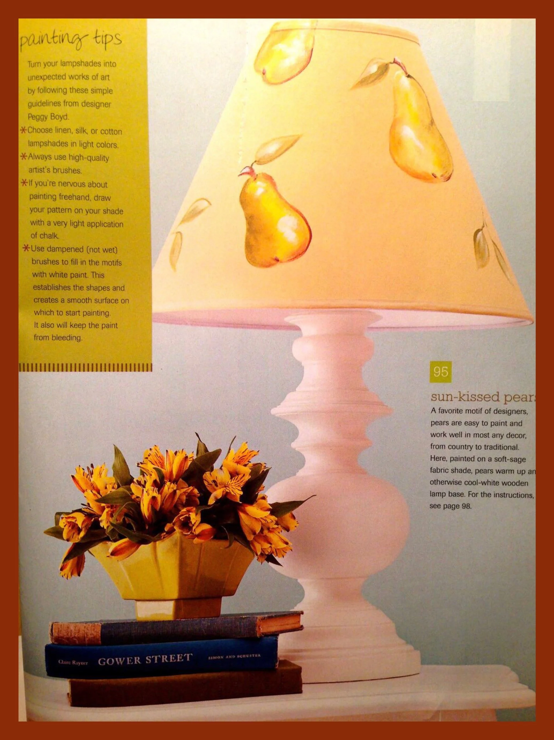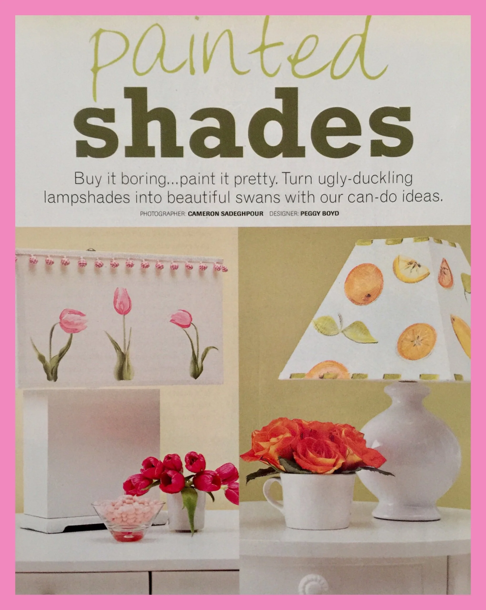 So then it hit me, several years back I did an article in Meredith Publication’s magazine, “100 Decorating Ideas” about creating custom lampshades with paint and minimal embellishments. It’s s a simple and easy DIY project for all painter/crafter levels. By painting your own design it allows you to start with a less expensive shade or reuse one that’s the perfect shape and size for your lamp.